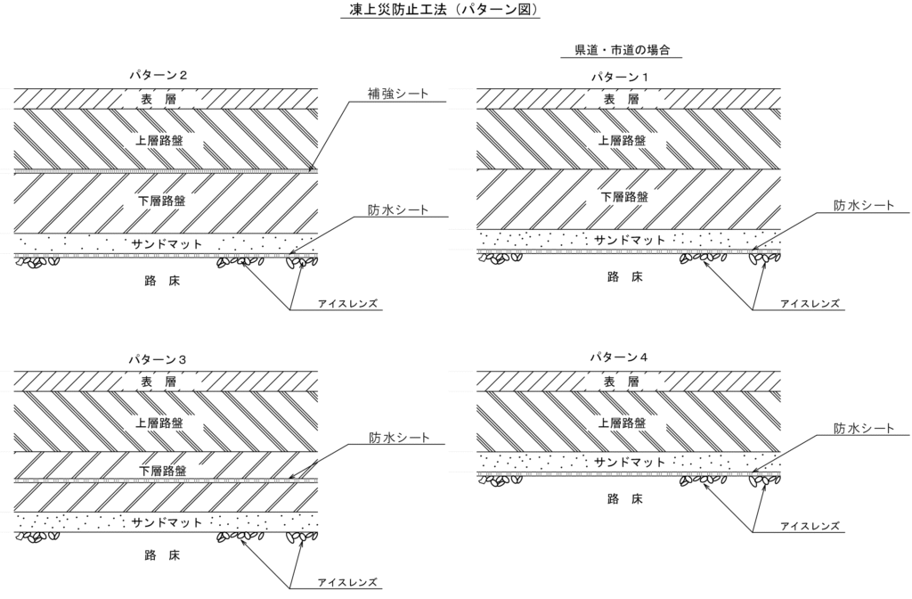 弊社の凍上災の防止法のパターン図を4種類示します。パターン1は路床の上に防水シートを敷設します。その上に、路盤2層設置します。パターン2はさらに上層と下層の間にすべり防止の為に路盤補強用の補強シートを設置します。パターン3は防水シートを路盤中に設置して補強シートと共用する設置法です。パターン4は路盤が薄い場合のシート設置法です。さらに地下水が多い路床に水抜きパイプを設置する場合もあります。