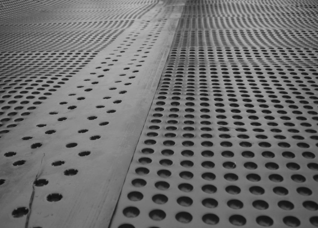 防水シートを敷設している状況写真です。ボッチトボッチで強固に防水していきます。このシートによりアイスレンズの発生を防止します。