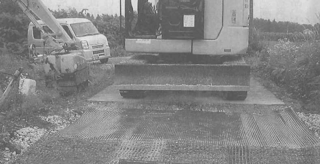 写真は、補強シートの敷設状況です。地盤が軟弱で円弧すべりなど路体が弱い場合に補強材として設置します。