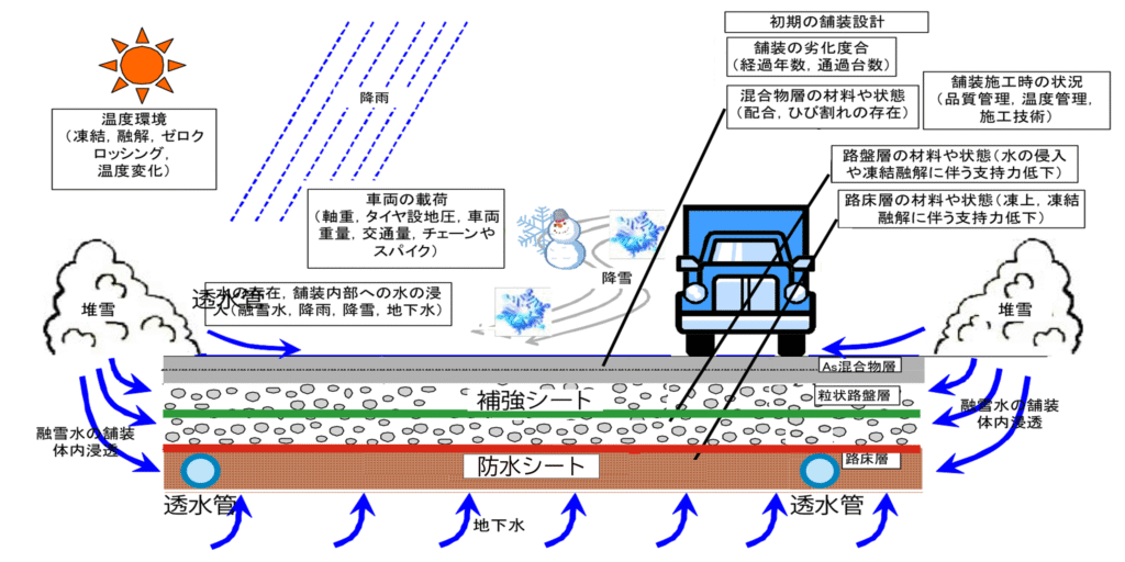 霜柱による地盤隆起を防ぎ、アスファルト舗装を健全に保護。