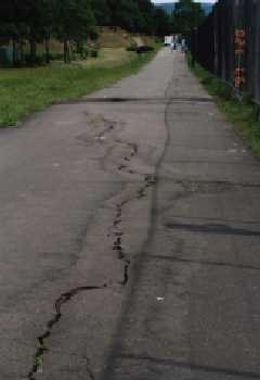 アスファルトは周りの土よりも冷やされやすく凍結が進みます。これは道路が除雪されている場合に顕著です。この結果、道路中央部で大きな凍上が生じ、アスファルトが破壊されます。 過重や地盤沈下のために生じたアスファルトのひび割れが車両進行方向に対して横向きに見られるのに対し、凍上害では縦方向のひび割れが道路中央付近に見られるのが特徴です。